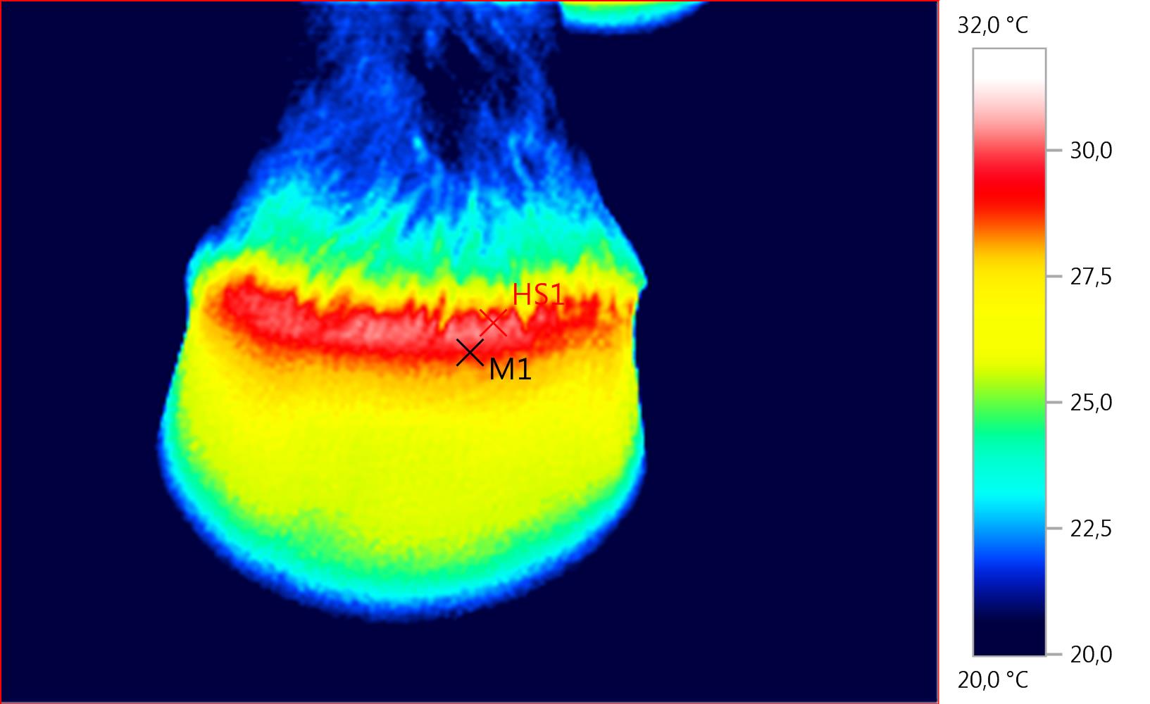 Mit der Thermographiemessung kann man die Verteilung der Oberflächentemperatur des Tierkörpers grafisch darstellen. So lassen sich unnatürlich heiße (Hot-Spots) oder kalte (Cold-Spots) Punkte erkennen, die für das menschliche Auge nicht sichtbar sind.